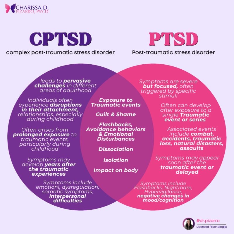 C-PTSD is more about prolonged, repeated trauma, often starting in childhood.